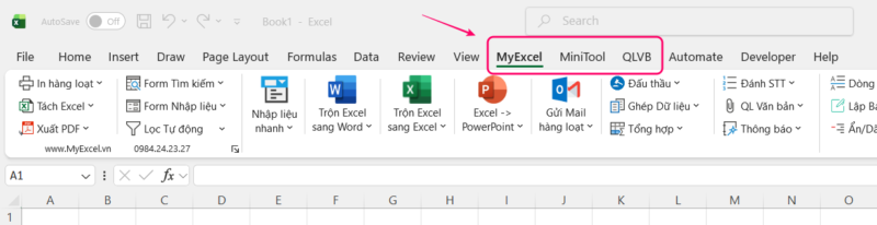 Sau khi tải xong, trên Excel của bạn sẽ được bổ sung 3 Tab mới gồm MyExcel, MiniTool và QLVB