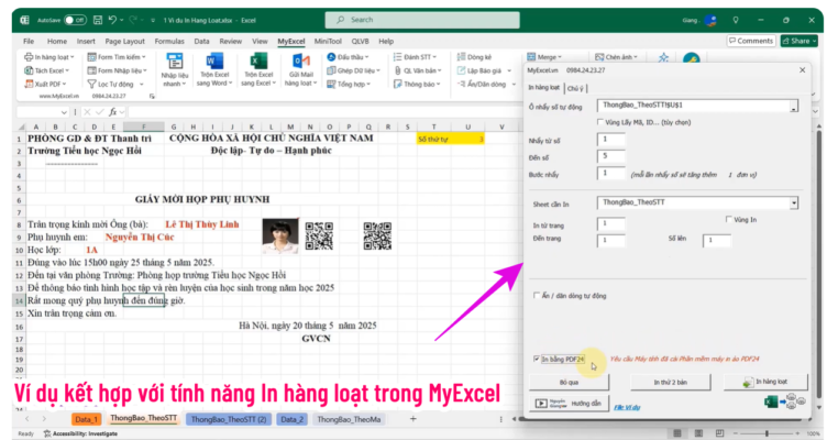 Áp dụng đặc tính đó, Bạn có thể kết hợp các tính năng khác của MyExcel để In hàng loạt, xuất PDF hàng loạt mẫu biểu, và mỗi khi in hàng loạt thì Mã QR Code sẽ tự động thay đổi theo từng phiếu