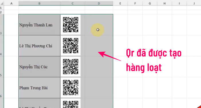 Bạn chọn ô chứa kết quả trả về, ấn Tạo QR Code hàng loạt, ta sẽ được kết quả như hình dưới