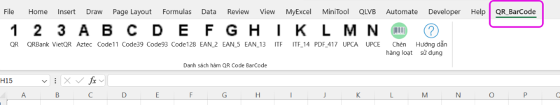khi đó trên Excel của bạn sẽ được thêm 1 Tab mới có tên là QR Barcode