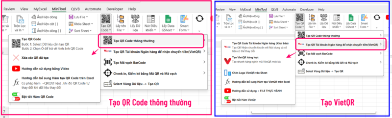 Ngoài tính năng tạo QR Code thông thường, MyExcel còn hỗ trợ tạo VietQR (QR code tài khoản ngân hàng, với số tiền và Nội dung thay đổi theo từng lần)