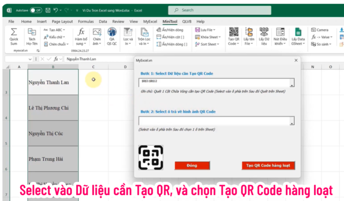 Để tạo được QR Code hàng loạt, bạn chỉ cần Select vào các dữ liệu cần tạo QR, chọn Tab MiniTool / Chọn Tạo QR Code / Chọn tạo QR Code thông thường / Chọn Tạo QR Code , một Form sẽ hiện ra